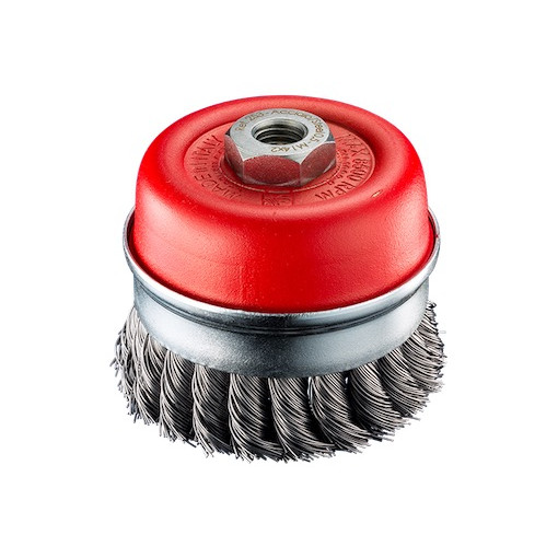 Drátěný hrncový copánkový kartáč do úhlové brusky|Pro těžké aplikace a maximální bezpečnost|Materiál: Ocel|Průměr: 85 mm|Drát: 0, 5 mm|Upínání: M14|Max. otáčky: 8500||Robustní, agresivní kartáč se zpevňovacím prstencem pro stacionární, automatické a CNC stroje a úhlové brusky s regulací otáček.|Ideální pro odstraňování strusky, rzi, nátěrů a silných nánosů, příprava a čištění svarů (např. čelně svařované trubky), odjehlení trubkových hrdel o velkém průměru, odstranění velkých otřepů|