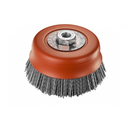 Drátěný hrncový kartáč do úhlové brusky kadeřavý|Vysoce odolné abrazivní nylonové vlákno|Materiál: Nylon|Průměr: 100 mm|Drát: 1 mm 180 gr|Délka drátu: 25mm|Upínání: M14|Max. otáčky: 8500||Použití k čištění kovových povrchů, dřeva, pryže, kamene a mramoru. Dají se rovněž použít ve vhodných strojích.||Aplikace: Lehké broušení, satinování, odstraňování drobných návarků a rzi, odjehlování trubkových hrdel.
