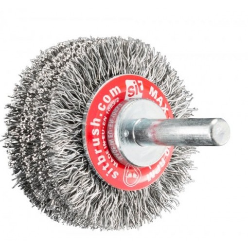 Okružní kartáč pr. 100mm, ocelový drát 0, 3, stopka 6x25, šíře 9mm, S. I. T. GG103||Velmi odolný kadeřavý drát s vysokou hustotou|Kartáč s velmi dlouhou životností|Efektivní pro různé použití v průmyslu||Vhodný pro těžké práce, maximální otáčky 10000 ot/min|Použití: Odstranění strusky, rzi a zbytků z povrchů jakéhokoli tvaru a materiálu.