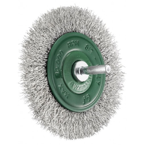 Drátěný kartáč se stopkou pr. 100mm, š. 9mm, upínání 6x21mm, nerez 0, 3mm||Obvodový kadeřavý kartáč na stopce pro vrtačky - jednořadý|Kartáč vhodný pro lehčí aplikace|Ideální pro špatně dostupná místa a vnitřní povrchy
