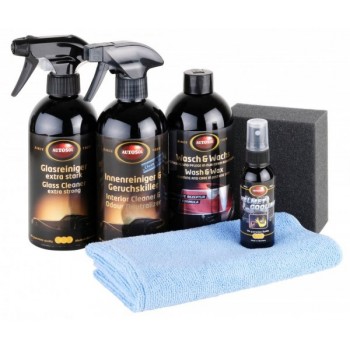 Sada pro základní péči o vůz. Obsahuje všechny potřebné přípravky k čištění jak interiéru vozu, tak exteriéru.||SADA OBSAHUJE:||autošampon s voskem Wash and Wax||čistič interiéru s pohlcovačem pachů Interior Cleaner Odour||extra silný čistič skel Glass Cleaner extra strong||mikroutěrku a nanášecí houbičku||koncentrovanou náplň do ostřihovačů s vůní broskve|