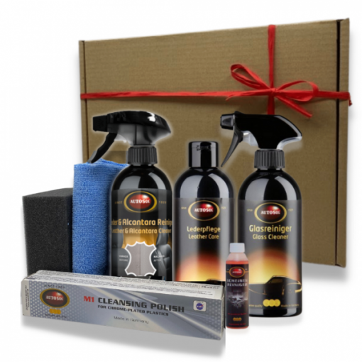 Dárková sada Autosol obsahuje kvalitní autokosmetiku na údržbu interiéru vozu s kůží.||Sada obsahuje:||- pěnový čistič na kůži a alkantaru Leather and Alcantara Cleaner - Pěnový čistič ve spreji pro všechny hladké kožené povrchy a materiál alcantara. Kůži navrací její pružnost.|- tekutý čistič ve spreji na čištění interiéru vozu (na plasty, čalounění, lakované plasty)|- extra silný přípravek na čištění skla Glass Cleaner Extra Strong|- čisticí a lešticí pasta na pochromované plasty M1 Cleaning Polish for Plastic Chrome - pasta obsahuje speciální lešticí prášek, který zaručuje minimální abrazi a maximální lešticí výsledky. Pasta povrch čistí a zároveň chrání.|- utěrku z mikrovlákna a aplikační houbičku|- koncentrovanou letní směs do ostřikovačů|+ dárek pasta na kov Metal…