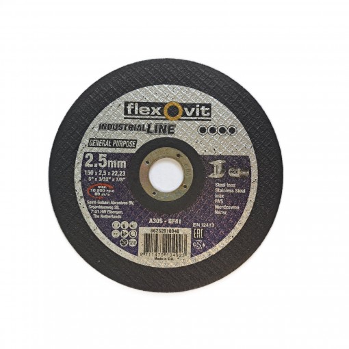 Řezací kotouč Flexovit Industrial Line, průmyslová řada General Purpose.||Dlouhá pracovní životnost a velmi vysoký výkon. Střední tvrdost.|Neobsahuje železo, chlor a síru. Použití na ocel a nerezovou ocel, inox.||66252831080